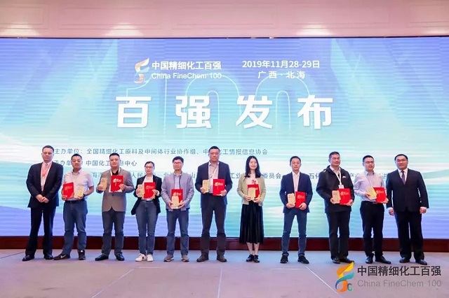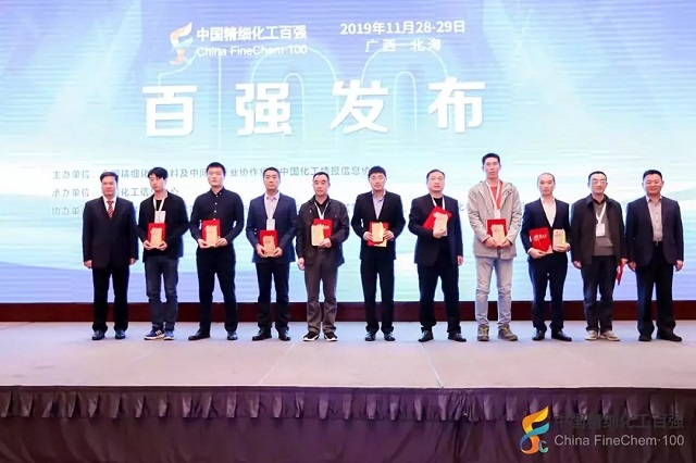 2019年11月28日,在由全国精细化工原料及中间体行业协作组、中国化工情报信息协会在广西北海联合主办,中国化工信息中心承办,北海市铁山港区人民政府、北海市铁山港(临海)工业区管理委员会协办的“第十九届国际精细化工原料及中间体(铁山港)峰会暨2019中国精细化工百强发布会”上,公布了“2019中国精细化工百强”榜单。
